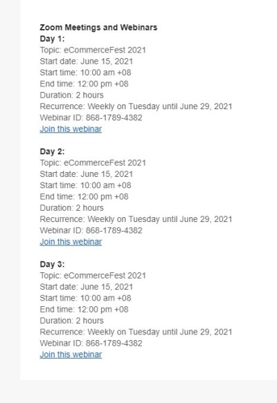 After you succeed to register eCommerceFest 2021, you will receive an email from Exabytes Events. The content of the email will show you the date and time of the event as below: