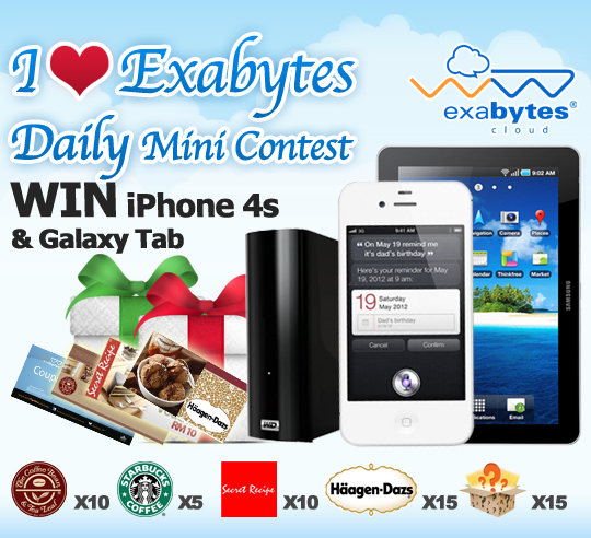 Yes! It’s that easy. And the best thing is that everybody can be a repeat winner. That is to say, if you win a voucher today, there is NO such a rule that you cannot participate tomorrow and win again. In fact, you can participate every day to maximize your chances of winning! Moreover, when number of Exabytes fans hits 45,000, 3rd Prize – 1TB External Hard Drive will be unlocked for winning. 2nd Prize – Galaxy Tab will be unlocked when Exabytes fans count reaches 50,000; Grand Prize – iPhone 4S will be unlocked when Exabytes fans count reaches 60,000.