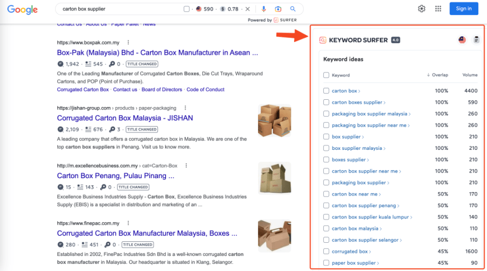 Apa yang anda perlu lakukan ialah memasang Google Chrome extension, Keyword Surfer dan memilihkan negara yang anda mahu. Seterusnya, ia akan menunjukkan jumlah carian di Google secara langsung.