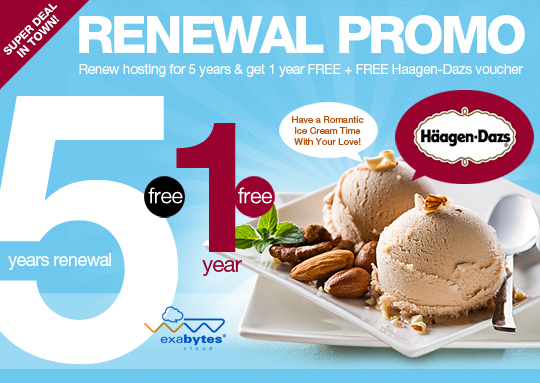 In this romantic season, not only Exabytes wants to wish all lonely hearts find their soulmates, we want to surprise you with our “Valentine’s Day 5+1 ‘n’ Haagen-Dazs Voucher Hosting Renewal Promo” which offers 1 YEAR FREE HOSTING applicable to all Exabytes shared hosting plans be it Ebiz Plus or Gold package when you renew for 5 years!